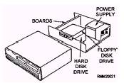 Figure 1-8.\A microcomputer system unit with the cover removed. as two floppy disk drives and two hard disk drives or any combination thereof, depending upon the particular configuration of your system. You would also see several boards (also referred to as cards). Some boards are used to control the peripheral devices of the system, while other boards work in conjunction with the microprocessor that is located on the system or motherboard itself. These boards provide the flexibility to add a variety of capabilities to a basic system. Certain boards are required, such as the system board that contains the main microprocessor(s). Others you might add to control a light pen or mouse device, or to handle a communications interface. Looking inside the computer system unit (figure 1-8), you will notice there are 5 available slots for board insertion. These various boards are plugged into what is called the motherboard. The motherboard is a printed circuit board that transmits the power and electronic signals between the other boards and peripheral devices. It is mounted to the bottom of the chassis of the computer, as shown in figure 1-9. Memory chips, on the newer micros, called single in-line memory modules (SIMMs), are located on the motherboard in a group of 4 or 8 slots. In older micros the memory chips are located on a memory expansion board. Most microcomputers also have a lithium battery installed on the motherboard. It provides power to the real-time clock when the system is turned off. The life expectancy of this battery is 3 to 5 years. Other boards you are likely to see in a typical microcomputer are the disk controller board, SCSI adapter board, and video display board (figure 1-9). We will take a look at each. SLOT A\SCSI ADAPTER BOARD.\ The small computer systems interface (SCSI) adapter board is used to control peripheral equipment, such as a CD-ROM drive. SLOTS B, D, E, F, AND H.\ Slots B, D, E, F, and H on this particular micro are reserved for future use. SLOT C\DISK CONTROLLER BOARD.\ Most disk controller boards are capable of supporting two internal hard disk drives, two internal floppy drives, and one external magnetic tape drive for tape backup. SLOT G-VIDEO DISPLAY BOARD.\ The video display board includes graphics memory chips to provide the system with graphics capabilities. Most micros come from the factory set for VGA (video graphics array) settings. By now, you should have a pretty good idea of what you can expect to see inside the system unit in the way of microcomputer boards. Before installing any internal components within the system unit, you must first carefully remove the outer cover. Be sure you are authorized to make such changes before removing the cover. However, before you go looking for a screwdriver, read the owner's manual very carefully, paying particular attention to the section on cover removal and the steps to follow. For example, the owner's manual might say: "Once all cabinet screws have been removed, raise the cover, keeping it as high as