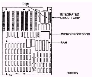 Figure 1-12.\The system/motherboard showing placement of the microprocessor, RAM, ROM, and integrated circuit chip. system makes all the difference in the world in terms of internal processing speeds (33MHz, 66MHz, 120MHz, and so on), number of bits handled (8, 16, or 32 bits), memory size (640K, 4M, 16M, and up), and the applications software it will run. Each microcomputer contains a specific microprocessor chip as its main processor. A microprocessor chip can typically handle 8, 16, or 32 bits of information at once. Generally speaking, the more bits a computer can manipulate at one time, the faster it can process program instructions and data, and the larger the main or primary memory it can accommodate. The type of chip in your computer or system unit also has a great effect on what you can do with your micro. For example, operating systems are written to serve a specific microprocessor chip, and applications programs that work under one operating system are not likely to work under another unless the program is modified. Many applications programs come in several versions to provide compatibility with several operating systems. These are just a few of the reasons why we say it is very important that you read all the documentation that comes with your microcomputer. The Navy uses many different types of microcomputers and microprocessor chips. To give you an idea of the variety, table 1-1 lists some of the microprocessor chips. |