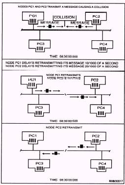 PROTOCOLS Network protocols are an important component; they define how networks establish communications between elements, exchange information, and terminate communications. Protocols have two major operational functions. They establish the circuit for transmission (handshaking) and for the transmission itself. Transmission is conducted subject to the line dicipline. The line discipline is the sequence of operations that actually transmits and receives the data, handles the error-control procedures, handles the sequencing of message blocks, and provides for validation for information received correctly. Two representative protocols, which control line dicipline, are: the Binary Synchronous Communications Protocol (Bisync) and the Synchronous Data Link Control (SDLC). l Bisync is a half-duplex protocol that transmits strings of characters at lower speeds over dial-up circuits. Information movement is one direction at a time, with each data transfer being answered by an acknowledgement. l SDLC is a control procedure that sends multiple blocks of data and returns a single acknowledgement for many blocks, thereby increasing the amount of time spent transmitting data. The bits that are put before and after the message at the transmitting end are removed at the receiving end, so only the message is presented to the user. The hardware chosen for the network plays apart in the choice of network protocol. Most users and many of the vendors that build clone-type equipment would like to see universal interfaces. Others feel that the availability of different specifications will lead to a proprietary set of equipment, even though they favor the overall IS0 specifications (which are covered later in this chapter). ACCESS METHODS Another decision to be made is which access method to use. Access methods are the arrangements used to ensure that each workstation has fair and equal access to the network. The access method that will be used is governed primarily by the network's topology and protocol. The principal access methods are contention and token passing. Contention The contention method features Carrier Sense Multiple Access (CSMA) and Carrier Sense Multiple Access with Collision Detection (CSMA/CD). (See figure 1-6.) Access for both is on "a first-come, first-served basis. The CSMA scheme is very similar to a citizens band (CB) radio. Stations with data to send listen to the channel and wait until it is clear to transmit. With CSMA/CD, if two or more workstations transmit simultaneously, their messages will collide. As soon as a workstation detects a collision, it ceases transmission, monitors the network until it hears no other traffic, and then retransmits. Most contention networks assign a unique retry algorithm to vary the wait-and-retry period. This algorithm reduces the likelihood that after a collision, two workstations will transmit retries simultaneously.