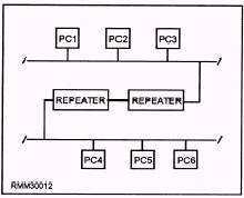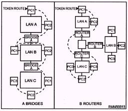 Figure 2-1.\Repeaters used to lengthen individual network segments. token-passing access method. However, we cannot connect a CSMA/CD segment to a token-passing segment. Bridges Bridges handle the first two layers of the OSI model\the physical layer and the data link layer. Like repeaters, bridges connect physically-isolated networks to forma single logical network; however, a bridge has a little more intelligence and can provide some translation between dissimilar protocols. For example, our token-passing segment wants to communicate with our CSMA/CD segment. The bridge will "repackage" the message from the token-passing segment into a format that the CSMA/CD segment will understand. Then, the bridge will act as a workstation on the CSMA/CD segment and contend for access. The same thing happens in reverse. A message is sent from the CSMA/CD segment to the token-passing segment. The bridge then "repackages" the message into a format the token-passing segment is expecting and waits for the token, just like any other workstation. An important point to remember is that a bridge will pass on any message it receives. Because the bridge is not smart enough to know that unlike LANs do not understand each other, it will go ahead and send the message. Because the two LANs speak a different "language," the message will be ignored. Routers Routers only connect networks running similar access methods. They work at the third layer of the OSI model\the network layer. Like bridges and repeaters, routers can connect networks over different wiring media and topologies. However, unlike bridges, routers can intelligently determine the most efficient path to any destination, based on predetermined delimiters. Routers are often a better choice for interconnecting remote installations and congested networks requiring a single protocol. Let's look at this more closely. Let's say we have a LAN made up of three token-passing segments, and each segment is connected via a bridge. For a message to go from LAN A to LAN C, it would have to travel through LAN A and LAN B before it reaches its final destination, which is LAN C. See figure 2-2, frame A. On a LAN that has large amounts of message traffic, we can see how a bridge may slow down the system. On the other hand, if the segments are separated by routers, the router on LAN A would look at the destination of the message and determine the direct route to LAN C that would be shortest route, as shown in figure 2-2, frame B. Brouters A brouter can work in either the second and third layers of the OSI model\the data link layer or the network layer. A brouter is a combination of a bridge and router combined. If it can't route a packet, it acts as a bridge. Brouters are particularly useful if you have two or more different networks. Working as a bridge, a brouter is protocol independent and can be used to filter local are a network traffic. Working as a router, a brouter is capable of routing packets across networks. Gateways Gateways work at OSI model layer 7\the application layer. A gateway functions to reconcile differences between two dissimilar networks. Messages are not only repackaged for transmission between different networks (CSMA/CD to token-passing), but the contents of the messages are converted into a format the destination can use and understand. Now our unlike LANs can talk to each other. Gateways can also provide links between microcomputer networks and mainframes. A gateway is generally a dedicated computer with an interface card and at least some type of software for both of the environments being connected. The gateway then runs special software that provides the necessary conversion and translation services which, in turn, allow the two environments to communicate.