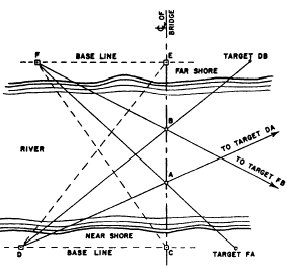 Figure 10-17.Method of locating piers. locate piers at A and B, you may use the following procedure:1. Establish base lines CD and EF and carefully reference them.2. Measure the length of each base line with a degree of accuracy suitable for the required accuracy of the line CE.3. Measure all angles of the triangles CDE and EFC.4. Compute the distance CE from the triangle CDE and check against the same distance computed from triangle EFC. The difference in computed lengths must be within the prescribed limits of error.5. Compute angles BDC, ADC, BFE, and AFE. 6. Draw a triangulation diagram, showing computed angles and distances and measured angles and distances. 7. Turn the computed angles BDC, ADC, BFE, and AFE. 8. Set targets DA and DB on the far shore and FB and FA on the near shore so that the intersecting lines can be reestablished without turning angles. Carefully reference these points. 9. Use two instruments to position piers. Occupy two points, such as C and D, simultaneously, using the intersection of sights CE and DA to locate the pier. Check the locations of points A and B if they are within the limits of error by sighting along the center line, CE. Piles. You may be required to position piles, record pile-driving data and mark piles for cutoff. Figure 10-18 shows points A and B established as a reference line 10 feet from the center line of a bridge. Stretch a wire rope between points A and B with a piece of tape or a wire rope clip at each pile-bent position (such as C or D).Locate the upstream pile (pile No. 1) by measuring an offset of 4 feet from the line AB at C. A template is then floated into position and nailed to pile No. 1 after it is driven. The rest of the piles are positioned by the template. If it is impractical to stretch a wire rope to the far shore, set up a transit at a convenient distance from the center line of the bridge. Position the piles by sighting on a mark located the same distance from the center line of the template. Before driving piles, you must measure the length of piles. Measure the distance between the piles by chaining.During pile driving, keep a complete record of the following: location and number of piles, dimensions, kind of woods, total penetration, average drop of hammer, average penetration under last five blows, penetration under last blow, and amount of cutoff. Mark elevations on the two end piles by nailing two 3- by 12-inch planks to guide the saw in cutting the piles to the specified height. |