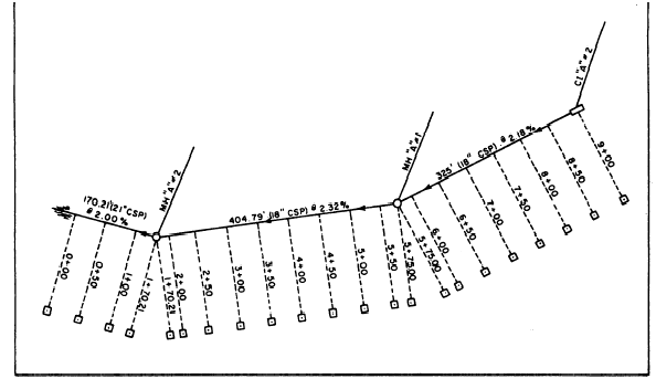 Sewer Stakeout To stake out a sewer, you obtain data from a plan and profile that shows (1) the horizontal location of each line in the system, (2) the horizontal location and char-acter of each manhole, (3) the invert elevations at each manhole, and (4) the gradient of each line. You will also have detail drawings of each type of appurtenance. If manholes in the same category are of different types, you may identify them by letter symbol, as CI "A," and so on. In addition, identification of a particular appurtenance may be by consecutive number, as CI "A" #3.The stakeout consists of setting hubs and stakes to mark the alignment and indicate the depth of the sewer. The alignment may be marked by a row of offset hubs and stakes or by both offset hubs and a row of center-line stakes. Cuts may be shown on cut sheets (also called grade sheets or construction sheets) or may be marked on the stakes, or both. The cuts shown on the center-line stakes guide the backhoe operator or ditcher operator; they are usually shown to tenths; they generally repre-sent the cut from the surface of the existing ground to the bottom of the trench, taking into account the depth to the invert, the barrel thickness, and the depth of any sand or gravel bed. The cuts marked on the stakes next to the hubs are generally shown to hundredths and usually represent the distance from the top of the hub to the invert; these cuts guide the pipe crew. The use of these cuts in transferring the information to batter boards or various types of offset string lines was de-scribed in chapter 14 of the EA3 TRAMAN.If the survey party stakes only the offset hubs, then the construction crew usually sets center-line stakes for line only and uses the hubs as a guide for the depth of excavation. The extent of the stakeout and computa-tions performed by the survey party and the correspond-ing extent of such work done by the construction crew depend on the capabilities and the availability of per-sonnel and the work load. In any case, hubs and/or stakes are generally set at 25-foot intervals, though 50-foot and even 100-foot intervals have been known to suffice.Sewer hubs are usually offset from 5 to 8 feet from the center line. Before you enter the field, you compute from the profile the invert elevation at every station where you will set a hub. Consider fig-ure 10-19, for example. This is a plan showing a line running from a curb inlet through two manholes to an outfall. The dotted lines are offsets (greatly exaggerated for clearness) to points where you will set the hubs. Note that at stations 5 + 75 and 1 + 70.21, you set two hubs, one for the invert in and the other for the invert out.The invert elevations at the manhole (MH) are given on the profile. Suppose that the invert out at CI "A" #2 is 122.87 feet. The gradient for this pipe is 2.18 percent. Station 8 + 50 lies 0.50 station from CI "A" #2; therefore, the invert elevation at station 8 + 50 is 122.87 feet minus (0.50 x 2.18), or 122.87 feet minus 1.09, or 121.78 feet. You compute the invert elevations at the other intermediate stations in the same manner. Suppose now that you are starting the stakeout at CI "A" #2. The final-location party left a center-line stake at this station. You occupy this point, turn 90 degrees left from the line to MH "A" #1, and measure off the offset; for example, 8 feet. This is presuming that, if the ground slopes across the line, the high side is the side on which the hubs are placed in figure 10-19. Hubs are always placed on the high side to prevent them from being covered by earth dozed off to form a bench for the trench-digging rig. You drive a hub 8 feet offset from station 9 + 00 and determine the elevation of the top of the hub. The vertical distance from the top of the hub to the invert at station 9 + 00 is the difference between the invert elevation and the elevation of the top of the hub. The invert elevation at station 9 + 00 is 122.87 feet. Suppose the elevation of the top of the hub is 126.94 feet. Then you would mark the guard stake for this hub, CI "A" #2 inv. C 4.07. Suppose the elevation of the top of the hub driven at station 8 + 50 is 127.33. The invert elevation at this station is 121.78; therefore, you would mark the guard stake for this station, 8 + 50, C 5.55.The manner in which the construction crew will use these hubs to dig the trench to grade will vary according to the preference of the supervisor for one of several methods. One method involves the erection of a batter board across the trench at each hub. The top of each board is placed on the posts at a set distance above invert elevation; for example, 10 feet. Fig-ure 10-20 illustrates this method.Take station 9 + 00 in figure 10-19, for example. The elevation of the top of the hub is 126.94 feet and the invert elevation is 122.87 feet. To be 10 feet above invert elevation, the top of the batter board must be placed on the post 5.93 feet above the top of the hub. To get this distance, the field constructor would simply