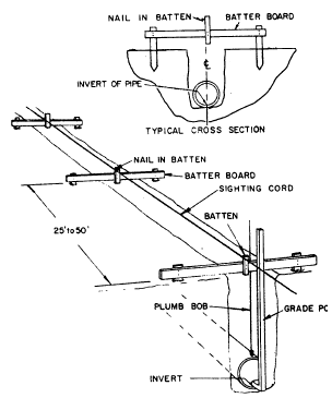 Figure 10-20.Setting sewer line to grade. subtract the specified cut from 10 feet. At station 8 + 50, for example, the height of the top of the batter board above the top of the hub would be 10 5.55, or 4.45 feet.The offset is measured off from a point directly above the hub along the batter board; a mark here is directly over the center of the pipeline. Battens are nailed on the batter board to indicate sewer center-line alignment. A string is stretched and tacked along these battens; this string indicates the horizontal loca-tion of the line and follows the gradient of the line, but at a distance of 10 feet above the invert. The amount of cut required to be taken out at any point along the line can be determined by setting a measuring pole alongside the string. If the string indicates 8.5 feet, for example, another 1.5 feet of cut must be taken out. Corners of rectangular manhole boxes are staked out much as building corners are staked out. For a box located where a line changes direction, it may be desired that the center line of the box bisect the angle between the lines. The box for a curb inlet must be exactly located with respect to a street curb to be constructed in the future; therefore, curb inlets are usually staked out with reference to the street plan, rather than with refer-ence to the sewer plan. |