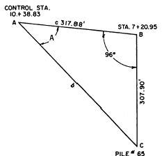 Figure 10-32.Trigonometric solution for pile No. 65. To determine the direction of this pile from control station 4 + 43.27, you would solve the triangle DBC shown in figure 10-31. You do this in the same manner as described above. First solve for b using the law of cosines and then solve for angle D using the law of sines. After doing this, you find that angle D equals 4726. It would probably be necessary to locate in this fashion only the two outside piles in each bent; the piles between these two could be located by measuring off the prescribed spacing on a tape stretched be-tween the two. For the direction from control station 10 + 38.83 to pile No. 65 (the other outside pile in bent M), you would solve the triangle shown in figure 10-32. Again, you solve for b using the law of cosines and then use the law of sines to solve for angle A. For each control station, a pile location sheet like the one shown in figure 10-33 would be made up. If desired, the direction angles for the piles between No. 61 and No. 65 could be computed and inserted in the intervening spaces.