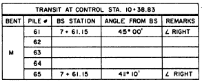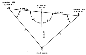 Figure 10-30.File location diagram. in each bent are 10 feet apart; bents are identified by letters; and piles, by numbers. The distance between adjacent transit setups in the base line is 10/sin 84, or 10.05 feet.Bents are located 20 feet apart. The distance from the center-line base line transit setup at station 7 + 41.05 to pile No. 3 is 70 feet. The distance from station 7 + 51.10 to pile No. 2 is 70 + 10 tan 6, or 70 + 1.05, or 71.05 feet. The distance from station 7 + 61.15 to pile No. 1 is 71.05 + 1.05, or 72.10 feet. The distance from station 7 + 31.00 to pile No. 4 is 70 - 1.05, or 68.95 feet; and from station 7 + 20.95 to pile No. 5 is 68.95 1.05, or 67.90 feet. You can determine the angle you turn, at a control station, from the base line to any pile location by triangle solution. Consider pile No. 61, for example. This pile is located 240 + 72.10, or 312.10 feet, from station 7 + 61.15 on the base line. Station 7 + 61.15 is located 1,038.83 761.15, or 277.68 feet, from control station 10 + 38.83. The angle between the line from station 7 + 61.15 through pile No. 61 and the base line measures 180- 84, or 96. Therefore, you are dealing with the triangle ABC shown in figure 10-31. You want to know the size of angle A. First solve for b by the law of cosines, in which b2 = a2 + c2 - 2ac cos B, as follows:b 2 = 312.102 + 277.682 - 2(312.10)(277.68) cos 96b = 438.89 feet Knowing the length of b, you can now determine the size of angle A by the law of sines. Sin A = 312.10 sin 96/438.89, or 0.70722. This means that angle A measures, to the nearest minutes, 4500.
