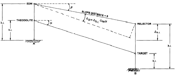 REDUCTION OF SLOPE DISTANCE As you learned in the EA3 TRAMAN, to reduce the slope distance of a line to horizontal distance, you need to know either the vertical angle of the line measured from the instrument or the difference in elevation between the ends of the line. With that information you can use the equations that you studied in chapter 12 of the EA3 TRAMAN to reduce the slope distance. As applied to chaining or transit-tape operations, the calculations are simple; however, as applied to EDM operations, the procedures are frequently a little more complicated, as you will see below. The methods of slope reduction that we will discuss in this chapter should be used only for slope distances that are less than 2 miles in length or for observed vertical angles that are less than 5 degrees. For a discussion of slope reduction when distances of over 2 miles or vertical angles greater than 5 degrees are encountered, you should study commercial publications, such as Surveying Theory and Practice, by Davis, Foote, Anderson, and Mikhail.Slope Reduction Using the Vertical Angle When the slope distance and the vertical angle are obtained from separate setups of an EDM and a theodolite, additional information is required for reducing the slope distance. This information includes the heights above the ground (h.i.) of the EDM transmitter and the reflector or remote unit, the h.i. of