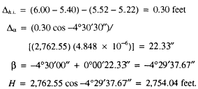 To understand how the above equations are used in practice, lets consider an example. Lets assume that the slope distance, s, from stations A to B (corrected for meteorological conditions and EDM system constants) is 2,762.55 feet. The EDM transmitter is 5.52 feet above the ground, and the reflector is 6.00 feet above the ground. The observed vertical angle is43000". The theodolite and target are 5.22 feet and 5.40 feet above the ground, respectively. Our job is to calculate the horizontal distance. To solve this problem, we proceed as follows: