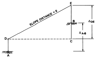 Figure 12-5.Slope reduction using difference in elevation. electro-optical systems, however, have the EDM transmitter built into the theodolite. In this way, the vertical angle and the slope distance can be observed simultaneously. In some of these models, there is a vertical offset between the electrical center of the transmitter and the optical center of the theodolite. Also, the height of the EDM reflector may not be at the same height as the target used to observe the vertical angle. For these conditions, you still need to consider these vertical offsets in the reamer described above. |