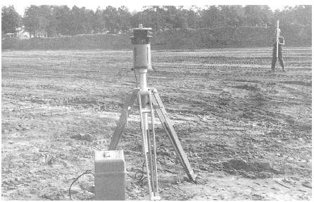 Figure 12-6.Rotating laser level. such as temperature and atmospheric pressure that the built-in atmospheric correction system needs, and by proper manipulation of the instrument controls, the operator can obtain horizontal angles, vertical angles, slope distances, horizontal distances, relative elevation, and coordinates of an unknown point. The data obtained is displayed through a liquid crystal display and can be transmitted and stored in a separate data collector. Complete operating instructions are provided with the tacheometer. |