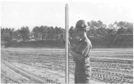 Figure 12-7.Laser-level rod equipped with a laser detector. consequent electrical impulses drive servomotors that automatically level the base and make the axis of the laser vertical. The laser beam is emitted at an angle 90 degrees to the axis of the laser by an optical train, and the optics rotate to form a horizontal reference plane. This device also can be side-mounted so the axis of the laser is in a horizontal position, and a vertical plane can be formed by the rotating beam. An electronic sensing device, parallel to the axis of the laser, allows self-plumbing of the rotating beam. The instrument is self-leveling and self-plumbing within a range of 8 degrees. Beyond 8 degrees, it will not operate. This is a safety feature. The tolerance specified for the position of the reference plane with respect to true level or true vertical is 20 seconds of arc. Thus, in a distance of 330 feet, a deviation of 0.03 feet is possible. |