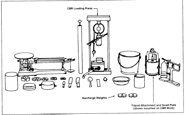 Figure 13-8.Laboratory CBR test equipment and tools. specimens are prepared; second, a penetration test is performed upon the prepared soil samples. Although one standardized procedure has been established for the penetration portion of the test, it is not possible to establish one procedure for the preparation of test specimens since soil conditions and construction methods vary widely. The soil test specimens are prepared to duplicate the soil conditions existing (or expected to occur later) in the field. Although penetration tests are most frequently performed on laboratory-compacted test specimens, they may also be performed upon undisturbed soil samples or in the field upon the soil in place. Detailed procedures for preparing the test samples and performing the test can be found in NAVFAC MO-330.CBR Test Equipment and Tools Figure 13-8 illustrates the equipment and tools needed to perform the CBR test. The principal piece of equipment is the CBR loading press. It is used to force the penetration piston into the compacted CBR specimen. The complete loading-press assembly (fig. 13-9) includes a penetration piston, proving ring and proving-ring dial, penetration dial, and a mechanical (or