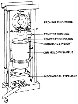 Figure 13-9.Assembled CBR loading press. motorized) type of jack. Three proving rings are available with capacities of 2,000, 5,000, and 7,000 pounds, respectively. The surcharge weights are used to approximate (within + 5 pounds) the expected weight of the pavement and base in the field. The tripod attachment (when fitted with a dial indicator) and the swell plate are used to measure the expansion, or swell, of the material in the CBR mold. Other items needed to perform the test are equipment and tools, such as a balance or scale, a CBR mold, a 10-pound tamper, mixing bowls, spoons, spatulas, a soaking tank or bucket, and moisture canisters. |