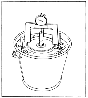 Figure 13-10.Apparatus for soaking a CBR test sample. number of surcharge weights needed to approximate the expected in-place weight of the pavement and base. One 5-pound surcharge weight is equivalent to 3 inches of overlying material. Then set in place the tripod attachment, dial, and swell plate, as shown in figure 13-10.Immerse the mold and the sample in water in the bucket and leave them to soak for about 4 days. An initial reading of the tripod dial is made when the sample is first placed in the water. Then, at the end of the soaking period, the dial is read again to determine the amount of swell. A swell in excess of 3 percent of the initial height of the specimen is considered to be excessive. After making the final reading of the dial, you remove the sample and mold from the water and allow them to drain for about 15 minutes before conducting the penetration test.Penetration Test In the penetration test, the bearing capacity of a soil is determined by measuring the extent to which the sample, placed in a mold, is penetrated by a penetration piston. The sample (in the CBR mold) is placed in the loading press, as shown in figure 13-9. The piston is placed on top of the material, and a proving ring is placed between the top of the piston and the top of the loading press.As the jack is cranked upward, the dial in the center of the proving ring records the pressure being applied to