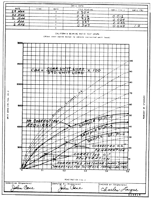 Figure 13-11B.Stress-penetration curves (reverse of CBR test data sheet DD Form 1212). The 5,000-pound proving ring was used for which the proving-ring constant was 12 pounds for every 0.0001 read on the proving-ring dial; for example, when the proving-ring dial reads 0.0111, the force being exerted by the piston is 12 x 111, or 1,332 pounds. see In the penetration data portion of the data sheet, you that the first column lists standard penetrations starting at 0.025 inch and increasing to 0.500 inch. The second column lists standard unit loads. The test was carried out by cranking the jack until the penetration dial reaches the standard penetration, then reading the load for that penetration on the proving-ring dial. Notice that for each dial reading there is a corrected dial reading that is 0.003 inch less that the uncorrected reading. This
