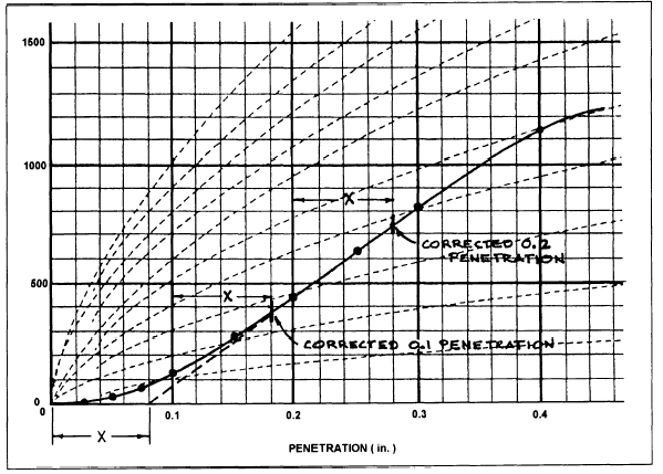 Figure 13-12.Adjusting the zero point of the curve. indicates that the proving-ring dial used for this test contained a previously determined index error of 0.003 inch. An error of this kind develops as a result of repeated compressions of the proving ring during testing.The figures under total load are the results obtained by multiplying the corrected dial reading by the proving-ring constant. Each unit load was obtained by dividing the total load by 3.Figure 13-11B is the reverse side of the CBR test data sheet. This side of the data sheet is used to plot the unit loads against the penetration depths to determine if a correction to the unit load is necessary.In figure 13-11B you see the curve for sample SF-PI-4 that we have been discussing. The convex shape of this curve indicates that no corrections were necessary. Sometimes, however, surface irregularities in the soil sample or disturbances during the test will result in curves having an initially concave shape, such as shown in figure 13-11B for samples SF-PI-5 and SF-PI-6. This shape indicates that a correction is necessary to obtain the true or corrected load. In this case, you must first adjust the zero point of the curve. Figure 13-12 illustrates the procedure you should use to adjust the zero point. First, draw a line that is tangent to the steepest portion of the concave curve and extend the tangent to the zero base line. The point of intersection of the tangent and the base line is the new zero-penetration point. The distance of the new zero point from the original zero point (distance X) is the distance that the 0.1 and 0.2 points are moved to the right to establish the corrected unit load.Finally, lets look again at figure 13-11A and discuss how the CBR values are determined. To compute the CBR values, you divide the unit load (or corrected unit load) at 0.1 and 0.2 inch by the standard unit loads of 1,000 and 1,500 psi, respectively. Each result is then multiplied by 100 to obtain the CBR in percent. The CBR is usually selected at 0.1 inch; however, when the CBR at 0.2 inch is greater, you should first rerun the test and then if the check tests give similar results at 0.2-inch penetration, the CBR at 0.2 inch should be used.