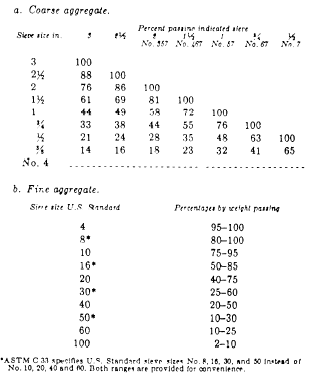 Tests for Aggregates For aggregate tests to be worthwhile, the sample secured for testing must be representative of the supply of aggregates. If possible, samples should represent the processed and ready-for-use aggregate. Sufficient samples should be taken from the processing plant discharge to represent the material in the stockpile. The sample should contain at least four times as much material as is needed for testing and should be reduced to the size desired for testing by quartering. The standard method for sampling aggregate can be found in ASTM D 75.Stockpile samples should be taken at or near the base, at about the middle, and at the top of the pile. Three or four such samples should be taken and recombined. A board shoved into the pile just above the point of sampling will prevent the material above the sampling point from falling or sifting into the sample.Unprocessed sources of sand and gravel should be taken by channeling exposed faces, or they should be taken from pits if exposures are not available. Take care to ensure that the samples include only those materials that are below the overburden or strip zone. TESTS FOR GRADATION. A sieve analysis indicates whether an aggregate is coarse or fine and whether it is evenly or unequally distributed between the larger and smaller sizes. This information is useful in deciding whether the aggregate will make good concrete. Analysis methods can be found in ASTM C 136. Table 13-2 shows the acceptable gradation limits.