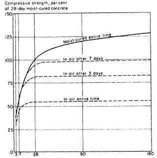 Workability Agents or Plasticizers The workability of concrete is governed by the amount of aggregate in the mix. Where reduction of aggregate (or increase in cement) is impractical, workability is increased by adding a plasticizer. Air-entraining agents, when used, are plasticizers. Other substances include calcium chloride, lime, fly ash, and other pozzolans. Calcium chloride is also an accelerator. Lime increases the cementing properties of cement, as do pozzolans combined with lime. Fly ash is inexpensive compared to cement and is used as a partial replacement (up to as much as 50 percent) of the cement. It changes both the plastic and the hardened properties of concrete. Fly ash improves workability and reduces segregation, bleeding, and the heat of hydration. The concrete will not be as watertight as a cement-only concrete, nor will it have as much initial strength. Additional tests may have to be made to determine when to remove the forms. Its final strength, however, will be as great as a cement-only concrete.Densifiers Dense concrete is required in some types of construction, such as in prestressed structures. This density is achieved when cement particles are separated evenly throughout the mix or at least prevented from attaching to each other (flocculating). A detergent admixture will disperse the particles individually and will create a more uniform paste. These admixtures also reduce the formation of a cement gel that expands at the early stages of hydration and pushes the particles apart, thus increasing the volume. Prevention of this expansion results in a denser paste.Waterproofing Agents Watertightness can be controlled to a great extent by lowering the water-cement ratio. This may not always be practical, and sometimes even with a low water-cement ratio, capillaries still form through the concrete. Densifying or using an accelerator like calcium chloride improves the watertightness.Air-Entraining Agents The greatest improvement in watertightness and resistance to deterioration under freezing and thawing is obtained by incorporating 4 to 6 percent, by volume, of entrained air into the mix. Workability of fresh concrete is enhanced by such entrained air. Air-entrained cement contains the necessary admixture.Soaps, butylstearate, some of the fine pozzolans, and several proprietary compounds are available for use as air-entraining admixtures with ordinary cements. These agents minimize the formation of capillaries and plug the tiny holes with a water-repellant or sealing material. They provide small, uniformly spaced, discrete air voids that prevent the buildup of damaging pressures from the expansion of freezing water into ice.CURING Concrete does not develop its full strength until the chemical process of curing (or hydration) is complete. Curing takes place over an extended periodthe most critical portion of which is from the day of placement through the 10th day. The extent and rate of curing depends upon the presence of moisture and the correct temperature within the mix.Temperature The ideal temperatures for concrete work are between 55F and 70F. Above this, rapid evaporation of moisture creates a problem. At lower temperatures, the curing or setting is delayed. Temperatures below 32F stop the hydration process. Since the chemical action gives off some heat, some method must be used to keep the heat within the structure during times of low temperatures. Cold weather construction may even require heating the ingredients, or mix, and covering the emplaced concrete or providing a heated enclosure. In hot weather, extra care is required to prevent a high temperature rise and too rapid drying of the fresh concrete. Moistening the aggregate with cool water will lower the generated temperature. The water is kept cool as possible by the application of reflective white or aluminum paint to water supply lines and storage tanks. On massive construction, such as dams and heavy retaining walls, the mixing water is often cooled artificially or ice is substituted for part of the water. This ice must be melted by the time the concrete is fully mixed and ready to leave the mixer. Cement replace-ment materials (such as pozzolans of diatomaceous earth, pumicites, or fly ash) may be used to depress concrete temperature by reduction of the heat of hydration in a structure; however, pozzolans vary widely and may have adverse effects on strength, air content, and durability, if used in excessive amounts.Moisture Concrete curing depends upon chemical action in the presence of water. Any loss of moisture during the process by seepage or evaporation prevents complete hydration and development of optimum strength and watertightness. Saturating the subgrade on which the concrete will be placed will delay, if not prevent, seepage. Wood forms should be thoroughly wetted if they have not been treated otherwise. Covering the concrete without marring the surface as soon as possible after finishing is one method used to reduce evaporation. This covering may be some material, such as burlap, straw, or plastic film, or it may be a chemical curing compound that is sprayed over the finished surface. After the initial set is attained, water can be applied directly to the surface to keep the hydration process in action. This water application can be part of the temperature control. The increase on concrete compressive strength with age is shown by curves in