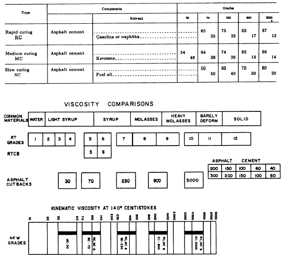 Figure 13-28.-Viscosity grades at room temperature. exposure to air the solvents evaporate and the asphalt cement is left to perform its function.The classification of the cutback is based on the rate of evaporation of the distillate that is in the mixture. Gasoline or naphtha (highly volatile) will produce a rapid-curing cutback (RC); kerosene (medium volatility), a medium-curing cutback (MC); and a fuel oil (low volatility), a slow-curing cutback (SC). At times, reference will be found to road oils, which are one of the SC grades of liquid asphalt, or in effect, a heavy petroleum oil. Table 13-5 shows the percentage of components by grade for the three types of asphalt cutbacks.As more cutterstock is mixed with a given amount of asphalt cement, a thinner liquid results. In practice, different amounts of cutterstock are added to a given amount of asphalt cement to obtain various viscosities, or grades, of cutbacks. The number assigned to each grade corresponds to the lower limit of kinematic viscosity measured in stokes or centistokes. The upper limit of each grade is equal to twice the lower limit or grade number. Thus a number 70 cutback refers to a viscosity range of 70 to 140 centistokes. The other grades and their limits are 250 (250-500), 800 (800-1600), and 3000 (3000-6000); in addition, the MC has a 30 grade. Figure 13-28 shows the scale of viscosity grades. The higher the viscosity, the thicker the liquid.Asphaltic penetrative soil binder is a special cutback asphalt composed of low penetration grade asphalt and a solvent blend of kerosene and naphtha. It is similar in character to a standard low viscosity, medium-curing