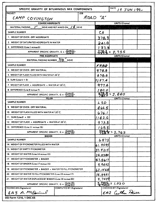 Figure 13-35.Data sheet for specific gravity of bituminous mix components (DD Form 1216). 4. After soaking the sample, place it in the bucket, which is filled with water. Then turn the bucket and aggregate sharply back and forth to help remove any air.5. Suspend the bucket from the brass hanger and bring the water level up to the overflow pipe.6. Determine the submerged weight using weights placed in the scoop on the right-hand pan. Record the weights in the appropriate spaces on the data sheet. The calculations required for the determination of the apparent specific gravity of coarse aggregate are shown on the data sheet and are self-explanatory.MIX DESIGN TESTS Mixture design tests for bituminous pavement are carried out on samples mixed and compacted in the laboratory to determine the optimum bitumen content, the optimum aggregate content, and gradation required to produce a pavement that will meet given quality specifications. Mixes with various bitumen and aggregate contents and gradations are prepared, compacted to specified density, and tested. From the test results, design engineers determine optimum values. Mix design test procedures vary considerably. this course can give only a general description of typical procedures. Mixture design is more fully discussed in NAVFAC MO-330 and at the EA1 level in Part 2 of this TRAMAN. |
