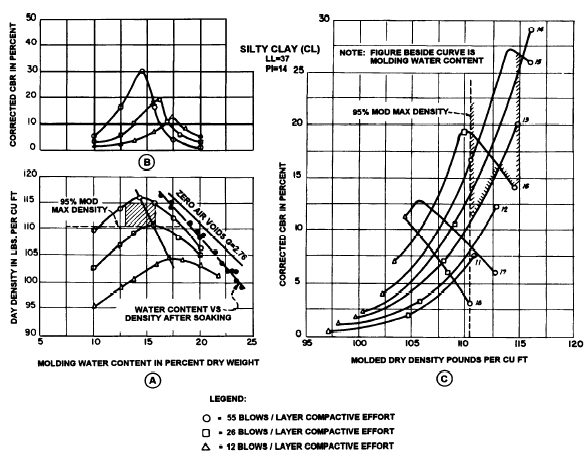 Figure 14-6.Resentation of CBR data. section is keyed to the construction currently being done. The person making soils tests in the laboratory today may be performing slump tests on the jobsite tomorrow. The testing section is usually small; and therefore, each person in the section must be trained to cope with all testing problems. In short, one of your main responsibilities as a supervisor is to train your people. |