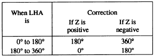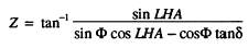 Two methods are used for determining an azimuth by observing the sun: the altitude method and the hour angle method. The basic difference between these two is that the altitude method requires an accurate vertical angle and approximate time, whereas the hour angle requires a very accurate time but no vertical angle.In the past, the altitude method has been more popular primarily because of the difficulty of obtaining accurate time in the field. The development of time signals and accurate timepieces, particularly digital watches with split time features and time modules for calculators, has eliminated this obstacle to the extent that the hour angle method is now preferred. The hour angle method is more accurate, faster, requires less training for proficiency, has fewer restrictions on time of day and geographic location, has more versatility (total-station instruments may be used), and is applicable to Polaris and other stars. To apply the hour angle method, you measure the horizontal angle from a line to the sun. Then, knowing the accurate time of observation and your position (latitude and longitude), you can compute the azimuth of the sun. This azimuth is then combined with the horizontal angle to yield the azimuth of the line.To compute the azimuth of the sun, use the following equation: where: Z = azimuth of the sun measured clockwise from north LHA = local hour angle of the sun d = declination of the sun F = latitude of the observer Z is normalized from 0 to 360 by adding algebraically a correction as listed below.