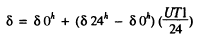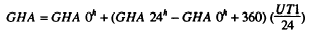 A negative declination indicates that the sun is south of the equator, and a negative value must be used in the above equation and in the azimuth (Z) equation. The Greenwich hour angle (GHA) of the sun is tabulated for 0 hours universal time of each day (Greenwich date) in the ephemeris. Interpolation is required at the UT1 time of observation and can be accomplished by using the following equation: