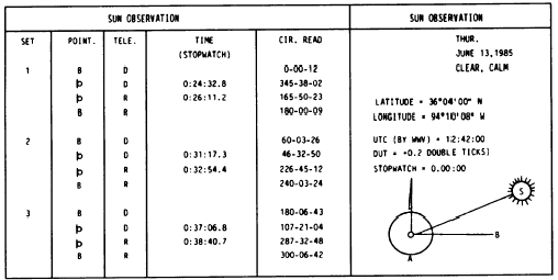 Figure 15-14.Sun-observation example field notes. hair becomes tangent to the suns image. Averaging the direct and reverse angles results in an angle to the center of the sun. Since the sun travels on a curved path, averaging the angles introduces a systematic error-the magnitude being a function of time between pointings. This error can be eliminated by computing an azimuth for each pointing and averaging the azimuths. An alternate procedure is to take both direct and reverse pointings on the same edge (usually the trailing edge). A correction, dH, is calculated from the suns semidiameter and is applied to the average horizontal angle. The semidiameter of the sun is tabulated in the ephemeris. The correction dH (a function of the suns altitude), should be computed by using the following formula (both observations, direct and reverse, should be made within 4 minutes):