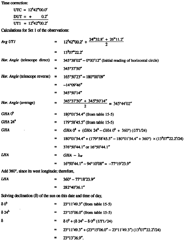 ZL can be normalized to between 0 and 360 by adding or subtracting 360. After azimuths of the line have been computed, they are compared and, if found to be within an acceptable limit, averaged. In working through the following example, refer to the field notes shown in figure 15-14. These notes illustrate the standard procedure of incrementing horizontal circles and micrometer settings for a directional theodolite. EXAMPLE: Determine the true azimuth of a line AB) on the ground from a celestial observation.1. Set the transit at station A and train it on B.2. Adjust the horizontal circle at zero and lock the lower motion. 3. Train the telescope on the sun and record the time at the instant the vertical cross hair is aligned on the edge of the sun. 4. Read and record the horizontal angle. 5. Invert the telescope and take another reading. 6. Repeat Steps 3 and 4 until all the necessary sun shots are completed. 7. Proceed with the computation The following calculations are for the field notes shown in figure 15-14: