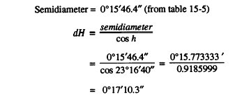 As shown in figure 15-14, the left edge of the sun (indicated by the symbols in the "point" column) was pointed both direct and reverse. That being the case, the correction dH is added to the average horizontal angle as follows: