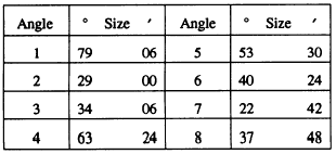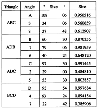 The angles that make up each of the four overlapping triangles, together with their natural sines, are as follows: