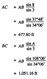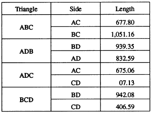 As you can see, for each of the unknown sides of the quadrilateral (AC, CD, and BD), values have been obtained by two different routes. You can also see that there are discrepancies in the values, almost the same for AC and BD and smaller for CD. All the discrepancies shown are much larger than would be tolerable in actual practice; they reflect the high imprecision of the original protractor measurement of the angles. The example has been given here only to illustrate the basic principles and procedures of chain-of-quadrilateral triangulation. Later in this chapter you will see how observed angles (measured in the field with the required precision) are adjusted to ensure that values computed by different routes will be practically close enough to each other to satisfy precision requirements. |