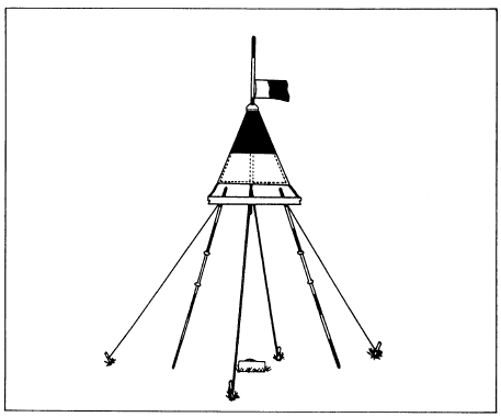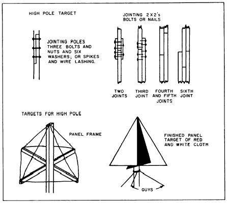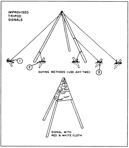 Figure 15-18.Tripod targets. well guyed and plumbed (fig. 15-18), and the legs should be set in depressions to prevent lateral movement. On uneven ground one leg may have to be shortened or dug in to maintain a symmetrical appearance from all directions. Signal cloth wrapped around the tripod should be used only on low-order (fourth-order) work as it is almost impossible to make it symmetrical around the station. BIPOD TARGET. Bipod targets are more simply constructed than tripods but are less stable and must be strongly guyed. Figure 15-19 shows a standard surveying biped target. It is carried disassembled in a canvas case about 53 inches long. It can be assembled, erected, and plumbed by two men in 15 minutes. If this target must be left standing in the weather for any extended period, the rope guys should be replaced with wire and two more wire guys added to each end of the crossbar. In soft ground the pointed legs will sink unevenly because of wind action and rain; therefore, they should be set in holes bored in the end of wooden stakes driven flush or in a short piece of 2-inch by 4-inch lumber laid flat in a shallow hole.POLE TARGETS. Pole targets (fig. 15-20) are seldom used because the station cannot be occupied while the target is in place. In certain cases, as when an unoccupied station must be sighted and cutting of lines of sight is difficult or impossible, a pole target that can be seen above the trees maybe erected The staff may be constructed of 2-inch by 2-inch lumber or cut poles, varying from about 2 inches to 6 inches in diameter. The method of joining sections of 2-inch by 2-inch lumber and the construction of a panel target are shown in figure 15-20. The targets must be plumbed by manipulation of the guy wires. Special care must be taken when warped or crooked boards are used to construct pole targets, and they must be checked for eccentricity.