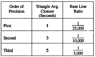 TRIANGULATION PROCEDURES A triangulation survey usually involves the following steps: 1. Reconnaissancemeaning the selection of the most feasible points for stations 2. Signal erection on these points 3. Measurement of angles 4. Determination of direction (or azimuth) 5. Base line measurement 6. Computations The first consideration with regard to the selection of stations is, of cause, intervisibility. An observation between two stations that are not intervisible is impossible. Next comes accessibility. Obviously again, a station that is inaccessible cannot be occupied and between two stations otherwise equally feasible, the one that provides the easier access is preferable. The next consideration involves strength of figure. In triangulation, the distances computed (that is, the lengths of triangle sides) are computed by way of the law of sines. Ths more nearly equal the angles of a triangle are, the less will be the ratio of error in the sine computations. The ideal triangle, then would be one in which each of the three angles measured 60; this triangle would, of course, be both equiangular and equilateral.Values computed from the sines of angles near 0 or 180 are subject to large ratios of error. As a general rule, you should select stations that will provide triangles in which no angle is smaller than 30 or larger than 150. Signal Erection After the stations have been selected, the triangulation signals or triangulation towers should be erected When you erect triangulation towers or signals, remember that it is imperative for these stations to be intervisible. It is also important that the target be large enough to be seen at a distance; that is, the color of the target must be selected for good visibility against the background where it will be viewed. When observations are made during daylight hours with the sun shining, a heliotrope is a very effective target. When triangulation surveys are made at night, lights must be used for targets. Therefore, target sets with built-in illuminations are very effective. Measurement of Angles The precision with which angles in the system are measured will depend on the order of precision prescribed for the survey. The precision of a triangulation system may be classified according to (1) the average error of closure of the triangles in the system and (2) the ratio of error between the measured length of a base line and its length as computed through the system from an adjacent base line. Large government triangulation surveys are classified in precision categories as follows: