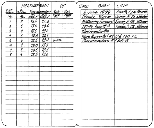 Figure 15-26.Field notes for base line measurement. Base Line Measurement The accuracy of all directions and distances in a system depends directly upon the accuracy with which the length of the base line is measured. Therefore, base line measurement is vitally important. A transit must be used to give precise alignment while measuring a base line. For third-order triangulation measurement with a steel tape, you are required to incorporate all the tape corrections described in the EA3 TRAMAN. For measurement over rough terrain, end supports for the tape must be provided by posts driven in the ground or by portable tripods. These supports are usually called chaining bucks. The slope between bucks is determined by measuring the difference in elevation between the tops of the bucks with a level and rod.On the top of each buck, a sheet of copper or zinc is tacked down, which provides a surface on which tape lengths can be marked Bucks are setup along the base line at intervals of one-tape length. The tape, with thermometers fastened at each end, is stretched between the supports and brought to standard tension by a tensiometer (spring balance). When the proper tension is indicated, the position of the forward end is marked on the metal strip with a marking awl or some other needle-pointed marker. At the same time, the thermometer readings are taken. If stakes, driven at tape-length intervals, are used as set back or set forward to bring the end again on the marking strip. The set back or set forward is entered in the field notes and deducted from or added to the tape length for that particular interval. Figure 15-26 shows field notes for a base line measurement. In this case the tape was supported on stakes, driven at full-tape, 100-foot intervals. With the exception of the interval between stakes 5 and 6, the amounts to the standard tape length (with the tape supported at both ends, and with standard tension applied), as corrected for temperature and for slope. For the interval between stakes 5 and 6 (where there is, as you can see, a forward set), the horizontal distance amounts to the standard tape length plus 0.104 foot, as corrected for temperature and for slope. The length of the base line will, of course, amount to the sum of the horizontal distances. Note that in this case the line is being measured forward. After the forward measurement, the line is again measured in the backward direction. If the backward measurement varies slightly from the forward measurement, the average is taken as the length of the base line. A large discrepancy would, of course, indicate a mistake in one measurement or the other. Rather than using chaining operations to perform base line measurements, an electronic distance meter (EDM) can be used. The use of EDM equipment greatly simplifies the measurement of base lines in triangulation. Chapter 12 of this TRAMAN gives a general discussion of EDMs and EDM principles. In triangulation of ordinary precision or higher, the observed angles are adjusted before the lengths of the least squares method that involves the computation of the most probable values of the adjusted quantities. In many advanced surveying textbooks, the least squares method