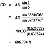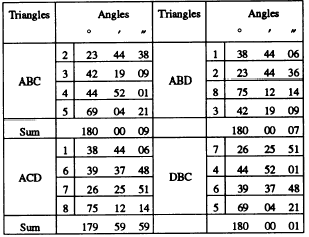 The sum of the closing errors for the four triangles is (09 + 01 + 07 + 01), or 18 seconds. The average triangle closure for the four triangles, then, is 18/4, or 04.5 seconds. For third-order triangulation, the maximum average triangle closure is 05 seconds; therefore, for the third-order work this closure would be acceptable. Base Line Discrepancy If AD is the base line in figure 15-28, then BC would be the adjacent baseline. assume that the baseline AD measures 700.00 feet and compute the length of BC on the basis of the angles we have adjusted. These angles now measure as follows:
