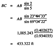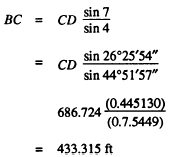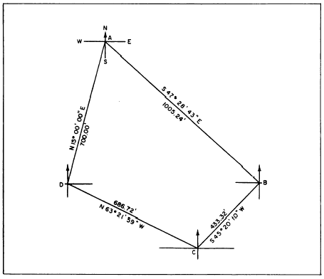 Figure 15-29.-Bearing and distances of a quadrilateral. Thus we have, by computation of two routes, values for BC of 433.322 feet and 433.315 feet. There is a BC would be taken to be the average between the two, or (to the nearest 0.01 foot) 433.32 feet.Suppose, now, that the precision requirements for the base line check are 1/5,000. This means that the ratio between the difference in lengths of the measured and computed base line must not exceed 1/5,000. You measure the base line BC and discover that it measures 433.25 feet. For a ratio of error of 1/5,000, the maximum allowable error (discrepancy between computed and measured value of base line) is 433.25/5,000, or 0.08 feet. The error here is (433.32 433.25), or 0.07 foot, which is within the allowable limit. |