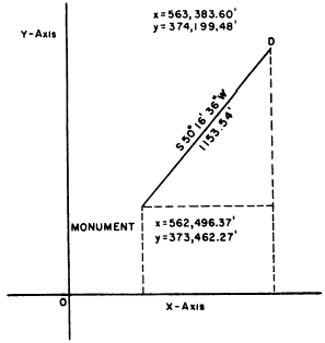 Figure 15-30.Coordinates. You would find the bearing of BC and CD similarly, except that you have to watch for the angle you are after. Always remember that a bearing angle does not exceed 90 and is always reckoned from north or south. To find the bearing of BC, you must find the sum of angle B (angles 3 and 4, fig. 15-28) plus the bearing angle of AB and then subtract it from 180; you can see that BC bears southwest, so just add this designation to the proper place in the bearing angle for BC. In this case, the bearing of BC will be 1800000 (421908 + 445159 + 472843), or S452010W. The bearing of CD is equal to angle C minus the bearing angle of BC.Coordinates Suppose that you are tying the quadrilateral shown in figure 15-29 into a state grid system. The nearest monument in this system lies 1,153.54 feet from station D, bearing S501636W from D, as shown in figure 15-30. This means that the bearing from the monument to D is N501636E. Suppose that the grid coordinates of the monument are y = 373,462.27 feet and x =562,496.37 feet.The latitude of the line from the monument to station D is 1,153.54 cos 501636, or 737.21 feet. The departure of the same line is 1,15354 sin 501636, or 887.23 feet. The y coordinate of station D equals the y D, or 373,462.27 + 737.21, or 374,199.48 feet. The x coordinate of station D equals the x coordinate of the monument plus the departure of the line from the monument to D, or 562,496.37 + 887.23, or 563,383.60 feet.Knowing the coordinates of station D, you can now A. The latitude of DA is 700.00 cos 150000, or 676.15 feet. The DA is 700.00 sin 150000, or 181.17 feet.The y coordinate of station A is equal to the y D plus the latitude of DA, or
