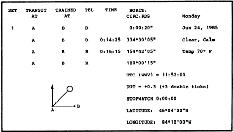 Figure 15-31.Sun observation field notes. 374,199.48 + 676.15, or 674,875.63 feet. The x coordinate of station A is equal to the x coordinate of D plus the departure of DA, or 563,383.60 + 181.17, or 563,564.77 feet. The coordinates of the other stations can be similarly determined. |