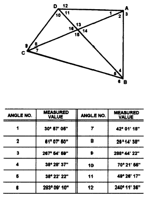 Figure 15-32.-Quadrilateral. Q9. After the quadrilateral shown in figure 15-32 is first figure adjusted what is the value of angle 5?A1. 24. A2. 0600. A3. The angular distance of a celestial body measured north or south of the celestial equator along the hour circle of the body. A4. Over the south celestial pole. A5. N4303. A6. S765500.1"E. A7. The calculation of the length of the sides can be cross-checked using different routes.A8. A primary triangulation station is used as an instrument station and a sighted station. A secondary station is used only for sighting.A9. 382218.25". |