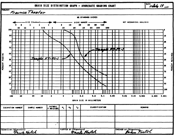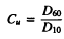 D60 means the grain size, in millimeters, indicated by the gradation curve at the 60-percent passing level. In figure 16-4, follow the 60-percent passing line to the point where it intersects the gradation curve for FT-P1-1; then drop down and read the grain size in millimeters indicated below. You read about 1.25mm.D10 means, similarly, the grain size indicated by the gradation curve at the 10-percent passing level. In figure 16-4, this is about 0.11mm. CM for this sample, then, is 1.25/0.11, or about 11.4. is as follows: |
