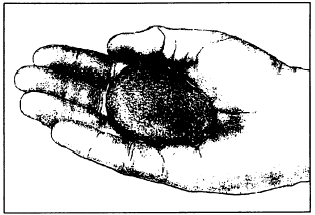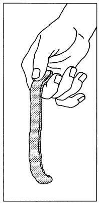 Figure 16-7.-Ribbon test. diameter is moistened with water. This sample should be just wet enough that the soil does not stick to your fingers upon remolding or just below the sticky limit. For testing, the sample is then placed in the palm of the hand and shaken vigorously. This is usually done by jarring the hand on the table or some other firm object or by jarring it against the other hand. The soil is said to have given a reaction to this test if, when it is shaken, water comes to the surface of the sample producing a smooth, shiny appearance. This appearance is frequently described as livery (fig. 16-8).The sample is then squeezed between the thumb and forefinger of the other hand. As this is done, the surface water quickly disappears and the surface becomes dull. The sample becomes firm, resisting deformation, and cracks occur as pressure is continued. Finally the sample crumbles like a brittle material.The vibration caused by shaking the soil sample tends to reorient the soil grains, decrease the voids, and force water, which had been within these voids, to the surface. Pressing the sample between the fingers tends to disarrange the soil grains and increase the void spaces. The water is then drawn into the soil. If the water content is still adequate, shaking the broken pieces