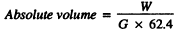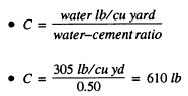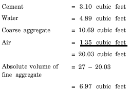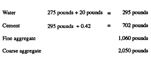 5. Calculate the coarse aggregate content. By using table 17-5 and interpolating between fineness moduli of 2.6 and 2.8, you find that for 3/4-inch aggregate having a fineness modulus of 2.7, the volume of dry-rodded aggregate per unit volume of concrete is 0.63. Therefore, the volume of coarse aggregate needed for 1 cubic yard of concrete is 0.63 x 27 = 17.01 cubic feet. Since the dry-rodded weight of the coarse aggregate is 102 pounds per cubic foot, then the weight of the coarse aggregate for a cubic yard of the concrete is 17.01 x 102= 1,735 pounds. 6. Calculate the absolute volumes. For one cubic yard of air-entrained concrete, the volume of the air can be determined by simply multiplying the air content by 27. For this mixture, the air content from Step 1 above is 5 percent; therefore, the volume of air is 0.05 x 27 = 1.35 cubic feet. For the cement, water, and coarse aggregate, the absolute volumes can be calculated using the following equation: where: W= weight of the material G= specific gravity of the material 62.4 = weight of water per cubic foot By substitution into this formula, the absolute volumes of the cement, water, and coarse aggregate are calculated as follows:Volume of cement (W = 610 pounds and G = 3.15) = 610 (3.15 x 62.4) = 3.10 cubic feetVolume of water (W = 305 pounds and G = 1) = 305 (1 x 62.4) = 4.89 cubic feet Volume of coarse aggregate (W = 1,735 pounds and G = 2.60) = 1,735 (2.60 x 62.4) = 10.69 cubic feet 7. Determine the fine aggregate content. To determine the weight of the fine aggregate needed for a cubic yard of the oncrete, you first need to add together the volumes obtained in Step 6 above. The resulting sum is then subtracted from 27 cubic feet to obtain the volume of the fine aggregate in a cubic yard of the concrete. This is shown as follows: