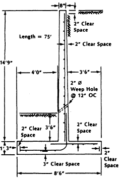 Figure 17-4.Retaining wall. to be poured, adding a waste factor, and multiplying this volume times the amount of each component in the 1-cubic-yard mix design. The manner of doing this is described in the following example. Example Problem: Using the mix design deter-mined previously in this chapter, determine the total amount of materials needed to construct the 75-foot-long retaining wall shown in figure 17-4. The 1-cubic-yard mix design is recapped below. Cement: 6.49 sacks (Type IA) Water 36.6 gallons Coarse aggregate: 1,735.0 pounds Fine aggregate: 1,153.0 pounds Air content: 5.0 percent To determine the total quantity of each of the above ingredients needed for the retaining wall, you must first calculate the total volume of concrete required. As you should know by now, an easy way to do this is to break the retaining wall into simple geometric shapes and then determine and accumulate the volumes of those shapes. Since you should know how to do this, we will simply say that the total volume of the retaining wall is 63.7 cubic yards. To this figure you add a 10-percent waste factor so that the adjusted amount of concrete needed for the project is 70.07 cubic yards. (Had the initial volume needed been greater than 200 cubic yards, you would have used a 5-percent waste factor.) Now that you know the total amount of concrete needed, you can determine the total quantity of each of the concrete ingredients by simply multiplying the amount of each ingredient needed for 1 cubic yard by the total amount of concrete required for the retaining wall. As an example, you need 1,153 x 70.07 = 80,790.7 pounds, or 40.4 tons, of fine aggregate for the retaining wall. The other ingredients are computed in the same way. That being done, you find that the following quantities of ingredients are need for the project: Cement: 455.0 sacks (Type IA) Water: 2,567.0 gallons Coarse aggregate: 60.8 tons Fine aggregate: 40.4 tons BITUMINOUS MIX DESIGN Hot-mix bituminous concrete for pavements is a mixture of blended aggregate filled with bituminous cement binder. The materials are heated while being mixed to promote fluidity of the bitumen for thorough coverage of the aggregate particles. The design of a bituminous concrete mix consists of the determination of an economical blend and gradation of aggregates together with the necessary content of bituminous cement to produce a mixture that will be durable, have the stability to withstand traffic loads, and be workable for placement and compaction with the construction equipment available. The procedures described in this section are performed during the design of a hot-mix bituminous concrete. They include testing, plotting the results on graphs, and checking the readings against values from the design tables. Testing of the ingredients and the mix is started before and continued throughout the paving operations. Specific test procedures are not covered in this discussion; instead, you should refer to chapter 13 of this TRAMAN and to Materials Testing, NAVFAC MO-330.GENERAL PROCEDURES AND GUIDELINES The objective of hot-mix design is to determine the most economical blend of components that will produce a final product that meets specified requirements. The following is a list of general procedures: 1. Prepare a sieve analysis of each of the aggregates available. 2. Determine the aggregate blend that will achieve the specified gradation (Paving and Surfacing Operations, TM 5-337). Plot the selected blend proportions on a graph with the allowable limits to see that it conforms.3. Determine the specific gravity of the components. 4. Using selected percentages of bitumen (TM 5-337), make trial mixes, and compute the design test properties of the mix. 5. Plot the test properties on individual graphs using the selected bitumen percentages. Draw smooth curves through the plotted points. 6. Select the optimum bitumen content (AC) for each test property from the curves of the Marshall test results. For a discussion of the Marshall stability test, you can refer to chapter 13 of this TRAMAN and to NAVFAC MO-330. 7. Average the bitumen content values (from Step 6) and, from the graphs, read the test property value corresponding to this average. 8. Check these read values with the satisfactoriness of mix criteria. The selection of the mix ratios of materials is tentative. The bitumen should be the same as the one to be used in construction. The aggregates and fillers must meet definite requirements. In general, several blends should be considered for laboratory mix-design tests. Gradation specifications are based on limits established by the U.S. Army Corps of Engineers as satisfactory. Within these limits, the following variables are considerations that will affect the final mix design: 1. Use of mix (surface course, binder course, or road mix) 2. Binder (asphalt, cement, or tar) 3. Loading (low tire pressure100 psi and under, or high tire pressureover 100 psi) 4. Maximum size of aggregate (in stockpile or based on thickness of the pavement course) Once the gradation specifications have been selected, you should check the available materials to determine how to proportion the blend to meet these specifications. You should study sieve analyses of the available aggregates and compute a series of trial blends. You may have to make adjustment of the blend after testing the design and prepared mix. The considerations for establishing and adjusting the blend are explained in TM 5-337. The determination of optimum bitumen content is based on a definite design and testing procedure known as the Marshall method. This method is explained in chapter 13 of this TRAMAN and in NAVFAC MO-330. The final step is the preparation of a job-mix formula to be furnished to the construction unit. It is recognized that at times it will be necessary to shorten the design procedure as much as possible to expedite military construction. For additional information, refer to TM 5-337. |