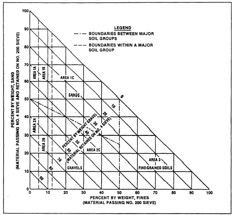 Table 18-2.Guide for Selecting a Stabilizing Additive these characteristics are combined with certain restrictions relative to liquid limit (LL) and soil gradation contained in table 18-2, they provide guidance for the selection of the additive best suited for stabilization. Figure 18-1 is entered with the percentage of gravel (percent material retained on the No. 4 sieve), sand (percent material passing the No. 4 sieve and retained on the No. 200 sieve), and fines (percent material passing the No. 200 sieve) to determine the area in which the soil gradation falls. The areas (1A, 2C, and 3) indicated at the intersection of the three material percentages are used to enter table 18-2 to select the type of stabilizing additive based on the various restrictions and remarks. For example, a soil having a PI of 15 and 57-percent gravel, 26-percent sand and 7-percent fines fall in area 2B of figure 18-1. Table 18-2 indicates that cement, lime, LCF, or bitumen could be considered. However, the PI of 15 eliminates bitumen, and the fact that only 33 percent of the material passes the No. 4 sieve indicates that lime or a combination LCF will be the best additive for Stabilization |