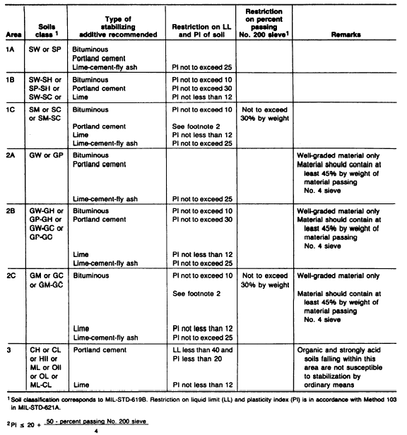 STABILIZERS This section discusses different types of stabilizers. It also provides a method of selecting the type or types of stabilizers that you can use for various conditions. Before a proper stabilizer can be selected, however, you must first perform, or have performed, a sieve analysis and Atterberg limits tests for the particular type of soil you are concerned with. Both sieve analysis and Atterberg limits testing are discussed in the EA3 TRAMAN and in Materials Testing, NAVFAC MO-330.LIME Experience shows that lime will react with many medium, moderately fine, and fine-grained soils to produce decreased plasticity, increased workability, reduced swell, and increased strength. Soils classified according to the Unified Soil Classification System (USCS) as CH, CL, MH, ML, OH, OL, SC, SM, GC, GM, SW-SC, SP-SC, SM-SC, GW-GC, GP-GC, ML-CL, and GM-GC should be considered as potentially capable of being stabilized with lime. CEMENT Cement can be used as an effective stabilizer for a wide range of materials. In general, however, the soil should have a PI less than 30. For coarse-grained soils, the amount passing the No. 4 sieve should be greater than 45 percent. Fly ash, when mixed with lime, can be used effectively to stabilize most coarse- and medium-grained soils. However, the PI should not be greater than 25. Soils classified by the USCS as SW, SP, SP-SC, SW-SC, SW-SM, GW, GP, GP-GC, GW-GC, GP-GM, GW-GM, GC-GM, and SC-SM can be stabilized with fly ash. BITUMINOUS Most bituminous soil stabilization has been performed with asphalt cement, cutback asphalt, and asphalt emulsions. Soils that can be stabilized effictively with bituminous materials usually contain less than 30 percent passing the No. 200 sieve and have a PI less then 10. Soils classified by the USCS as SW, SP, SW-SM, SP-SM, SW-SC, SP-SC, SM, SC, SM-SC, GW, GP, SW-GM, SP-GM, SW-GC, GP-GC, GM, GC, and GM-GC can be effectively stabilized with bituminous materials provided the above-mentioned gradation and plasticity requirements are met. Combination stabilization is specifically defined as lime-cement, lime-asphalt, and lime-cement-fly ash (LCF) stabilization. Combinations of lime and cement often are acceptable expedient stabilizers. Lime can be added to the soil to increase the workability and mixing characteristics of the soil as well as reduce its plasticity. Cement can then be mixed into the soil to provide rapid strength gain. Combinations of lime and asphalt are often acceptable stabilizers. The lime addition may prevent stripping at the asphalt-aggregate interface and increase the stability of the mixture.SELECTION OF A STABILIZER In the selection of a stabilizer additive, the factors that must be considered are the type of soil to be stabilized, the purpose for which the stabilized layer will be used, the type of soil quality improvement desired, the required strength and durability of the stabilized layer, and the cost and environmental conditions. The soil gradation triangle in figure 18-1 is based upon the pulverization characteristics of the soil. When