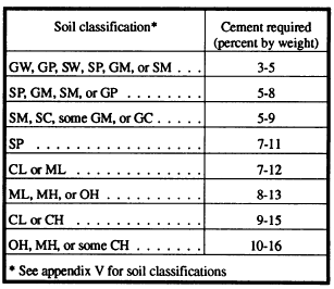 Table 18-3.Basic Range of Cement Requirements Since maximum density varies only slightly with variations in the cement content, only the median value is used in preparing specimens for the test. Additional information on selecting the cement content can be found in chapter 5 of NAVFAC MO-330.The procedures for determining the OMC are similar to those described in chapter 13 of this TRAMAN with the following exceptions:1. Compaction is performed on five layers of approximately equal thickness to result in a total compacted depth of 5 inches.2. Each layer is compacted by 25 uniformly spaced blows using a 10-pound tamper dropped from a height of 18 inches.. The wet-dry test (ASTM D 559) determines the cement content for soil-cement mixtures used in nonfrost areas. The objective is to determine the minimum amount of cement that will enable the soil-cement mixture to pass the test. For the test, specimens are molded using the OMC and the cement contents described above for different soil classifications. Use the procedure for the OMC determination to mold the specimens, and take a 750-gram sample from the second layer for a moisture determination. Cure the specimens for 7 days in high humidity. After curing, the specimens are weighed and submerged in tap water at room temperature for 5 hours. They are then oven-dried for 42 hours at 160F. Material loosened by wetting and drying is then removed using two firm strokes of a wire brush. After this, you then reweigh the specimens and subtract the new weight from the old weight to determine the amount of disintegration (soil-cement loss) that occurred during the cycle. The process is repeated for a total of 12 cycles. A passing grade ranges from 14-percent loss for sandy or gravelly soils down to 7 percent for clayey soil. Additional information about the wet-dry test and an example of determining the soil-cement loss can be found in NAVFAC MO-330.. The freeze-thaw test (ASTM D 560) determines the cement content for soil-cement mixtures used in areas subject to frost action due to repeated freezing and thawing. As in the wet-dry test, the objective of the freeze-thaw test is to determine the minimum amount of cement that enables the mixture to pass the test. For the test, specimens are molded and cured in the same manner as the wet-dry test. After 7 days of curing, the specimens are placed on moist blotters and are refrigerated for 24 hours at -10F. They are then thawed in a moist atmosphere at 70F for 23 hours. Then you sharp-pointed instrument. After 12 cycles, the specimens are oven-dried and weighed. The soil-cement loss is determined the same way as in the wet-dry test. Again, passing grades range from 14-percent loss for sandy or gravelly soils down to 7 percent for clayey soil.For additional information regarding the freeze-thaw test, you should refer to NAVFAC MO-330. The principal requirement of a hardened soil-cement mixture is to withstand exposure to the elements. Strength is a requirement also; however, most soil-cement mixtures that have adequate resistance to the elements also have adequate strength. In the ranges of cement contents producing results meeting the requirements above, the strength of soil-cement specimens tested in compression at various ages should increase with age and with increases in cement. A sample that has an unconfined compressive strength of approximately 300 pounds per square inch (psi) after curing 7 days and shows increasing strength with age can be considered adequately stabilized. NAVFAC MO-330 has the procedures that you should follow when performing unconfined compression tests.For a discussion of modified mix design for sandy soils and for approximate and rapid test procedures that you can use when complete testing is impracticable, you should refer to NAVFAC MO-330. Construction methods using soil-cement can be found in Military, Soils Engineering, FM5-541, and in commercial publications, such as Moving the Earth, by Herbert L. Nichols, Jr., and various publications from the Portland Cement Association. |