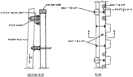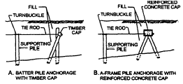 steel wale that runs horizontally along In stable soil above the groundwater level, the anchorage for a bulkhead may consist simply of a buried timber, a concrete deadman, or a row of driven and buried sheet piles. A more substantial anchorage for each tie rod is used below the groundwater level. Two common types of anchorages are shown in figure 1-18. In view A, the anchorage for each tie rod consists of a timber cap, supported by a batter pile, which is bolted to a bearing pile. In view B, the anchorage consists of a reinforced concrete cap, supported by a pair of batter piles. As shown in the figure, tie rods are supported by piles located midway between the anchorage and the bulkhead. Bulkheads are constructed from working drawings like those shown in figure 1-19. The detail plan for the bulkhead shows that the anchorage consists of a row of sheet piles to which the inner ends of the tie rods are anchored by means of a channel wale. The section view shows that the anchorage will lie 58 feet behind the bulkhead. This view also suggests the