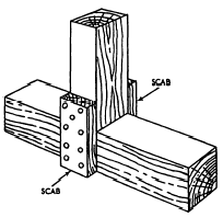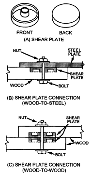 Figure 1-28.Shear plate and shear-plate joints. smaller than the bolt diameter and about 3 inches shorter than the bolt length. Driftbolts are from 1/2 to 1 inch in diameter and 18 to 26 inches long.Butt joints are customarily connected using driftbolts; however, another method of making butt-joint connections is to use a scab. A scab is a short length of timber that is spiked or bolted to the adjoining members, as shown in figure 1-26. |