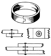 Figure 1-27.Split ring and split-ring joints. washers under both the bolt head and the nut. The bolts are then tightened until the washers bite well into the wood to compensate for future shrinkage. Bolts should be spaced a minimum of 9 inches on center and should be no closer than 2 1/2 inches to the edge or 7 inches to the end of the timber.Driftbolts, also called driftpins, are used primarily to prevent timbers from moving laterally in relation to each other, rather than to resist pulling apart. They are used more in dock and trestle work than in trusses and building frames. A driftbolt is a long, threadless rod that is driven through a hole bored through the member and into the abutting member. The hole is bored slightly