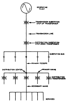TRANSMISSION SYSTEM Refering to figure 2-1, you will see that the starting point for electrical power is its place of generation, or generating station, which uses fossil fuels, water pressure, or, in some locations, nuclear energy to drive turbine generators. The energy generated in these stations is generally in the range of 13,200 to 24,000 volts. That voltage is insufficient for economical transmission over long distances. Therefore, the voltage is raised to transmission levels of 138,000 to 765,000 volts at a transmission substation located at the generating station. A substation is a facility that contains transformers, switches, and other equipment that is used to raise or lower voltages to transmission or distribution levels and to protect the substation and the transmission lines or distribution feeders against faults. Sets of conductors that are energized with high voltage and transmit large bulks of power over relatively long distances are known as transmission lines or transmission circuits. Usually, these circuits are run overhead with structures supporting the conductors, which are attached to insulators. In some locations where it is not practical or permissible to have overhead high-voltage lines, the transmission lines may be run underground. The transmission lines shown in figure 2-1 are overhead and supported by towers.As shown in the figure, the transmission lines, or circuits, deliver power from the transmission sub-station located at the generating plant to customers located along the route. Where required throughout its length, transmission circuits are equipped with additional transmission substations that lower the voltage to reduced transmission (or subtransmission) levels. The transmission circuits are also equipped with distribution substations that reduce the voltage to required distribution levels. It is at the distribution substations that the distribution system begins.DISTRIBUTION SYSTEM The distribution system is that portion of the electrical power system that connects the transmission system to the users equipment. It includes distribution substations, feeder circuits, distribution centers, primary mains, distribution transformers, protective devices, secondary circuits, and services. Figure 2-2 shows the principal elements of a distribution system. A power distribution system may be either an overhead distribution line or an underground cable